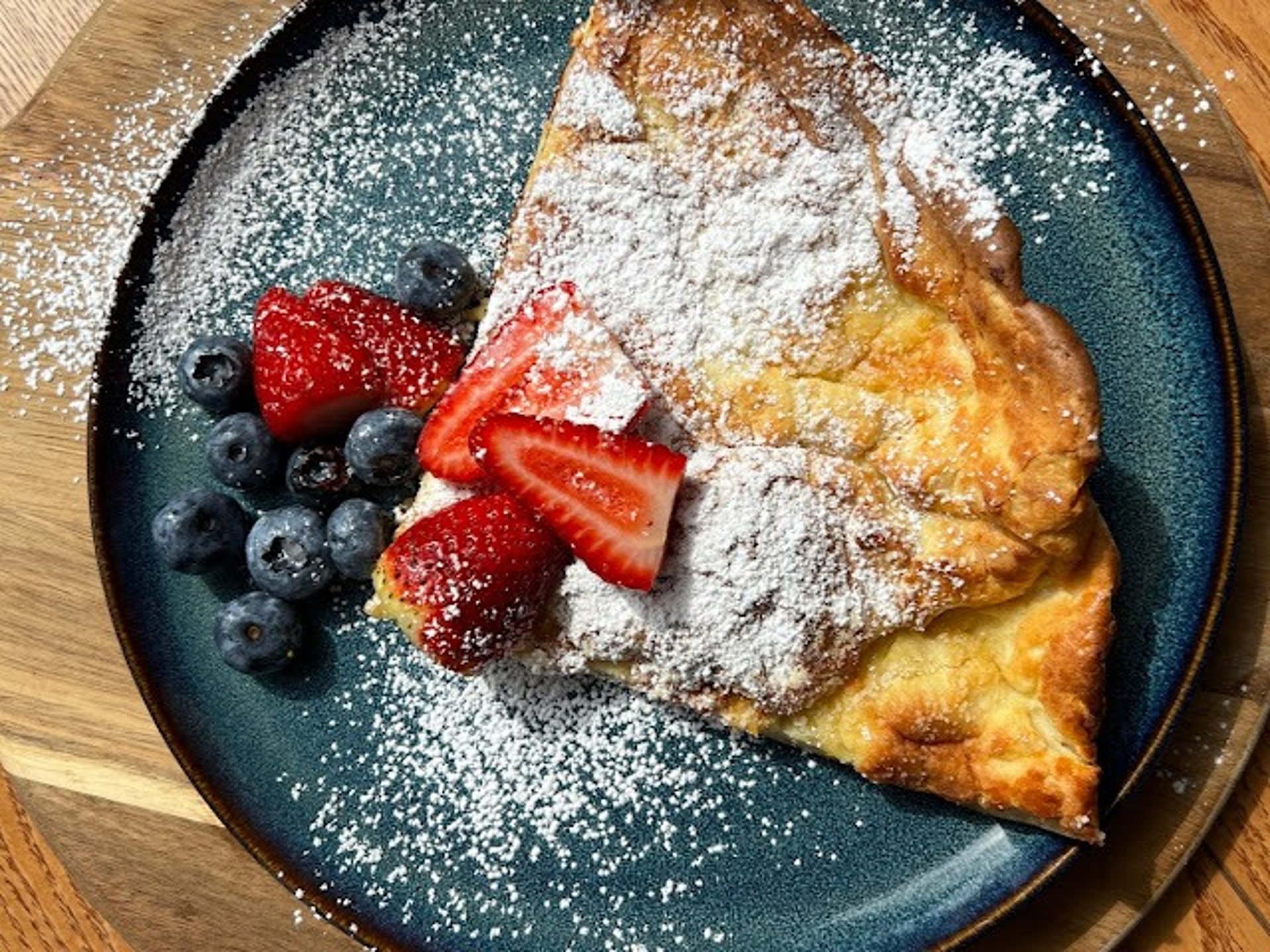 It will deflate slightly as it cools—this is normal! Dust with powdered sugar, serve with fresh fruit, a squeeze of lemon, or drizzle with maple syrup.